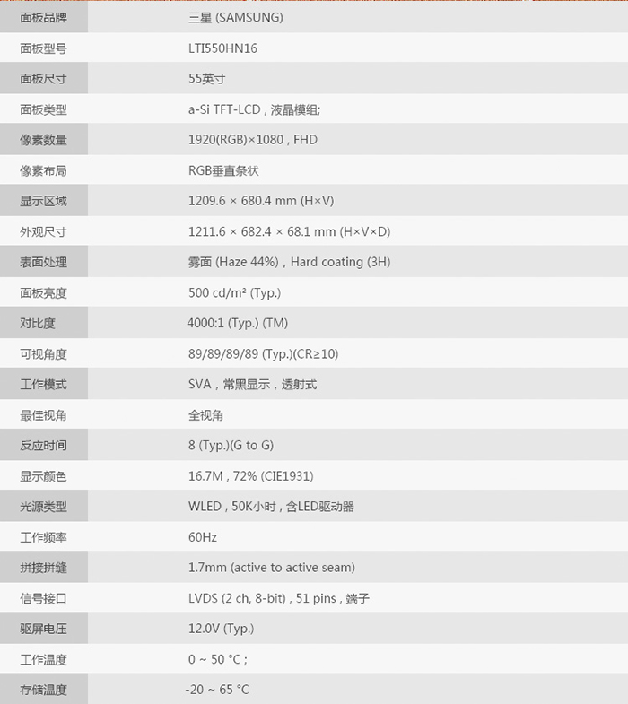 液晶屏尺寸        55 寸TFT真彩液晶屏