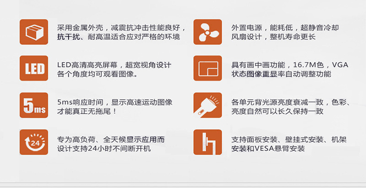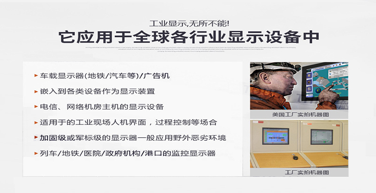 創(chuàng)視紀(jì)工業(yè)顯示器就是應(yīng)用在工業(yè)控制過(guò)程或設(shè)備的顯示器。它與民用或商用的顯示器的主要區(qū)別是外殼設(shè)計(jì)一般采用全鋼設(shè)計(jì),面板分為普通鐵板、不銹鐵、不銹鋼、鋁面板等不同材質(zhì),防塵、防震的特殊設(shè)計(jì),采用工業(yè)級(jí)的液晶顯示屏,在對(duì)環(huán)境要求較高的情況下,考慮采用寬溫(-40至85度)的液晶顯示屏,創(chuàng)視紀(jì)工業(yè)顯示器的防塵等級(jí)最高為6,防水最高為8 。