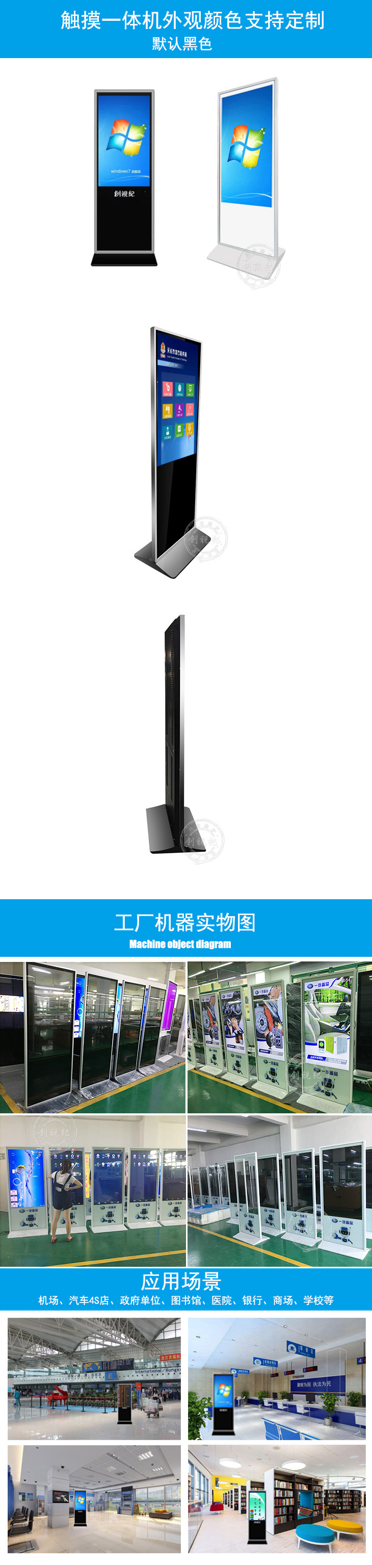 觸摸屏查詢一體機是一款智能觸摸查詢設(shè)備。它集觸控、液晶顯示、電腦主機于一體,可用于觸控互動、查詢信息多媒體教學(xué)等。觸摸一體機主體由流暢的直線構(gòu)成,簡約,時尚,符合現(xiàn)代社會流行趨勢。整體造型設(shè)計利于人體機學(xué)設(shè)計,使用戶擁有更舒適、更便捷、更貼心的視覺觸覺雙重體驗。外觀款式有分壁掛式,落地式,臥式,適用不同的應(yīng)用場所。