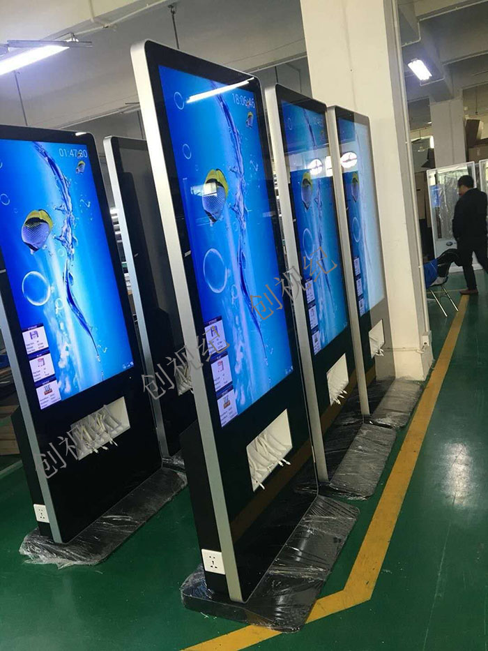 55寸落地款充電廣告機(jī)帶安卓系統(tǒng),WIFI,軟件,每臺都有帶4個電源插頭,每邊2個,讓您在給手機(jī)補(bǔ)充能量的時候,欣賞我們創(chuàng)視紀(jì)廣告機(jī)帶來的完美視覺享受!