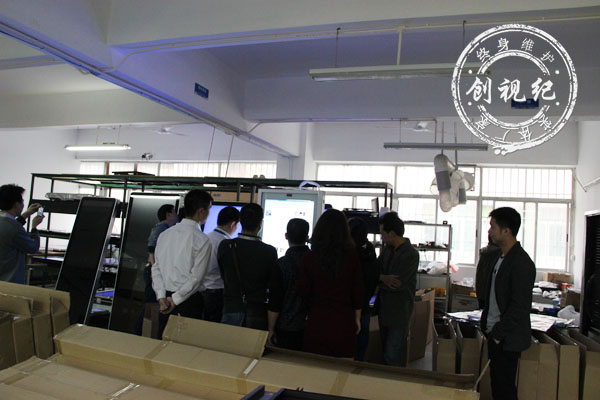 5、各企業(yè)家參觀公司生產(chǎn)平臺、老化平臺,QC平臺,對公司研發(fā)的觸摸一體機實現(xiàn)的自動佩戴眼鏡功能饒有興趣。