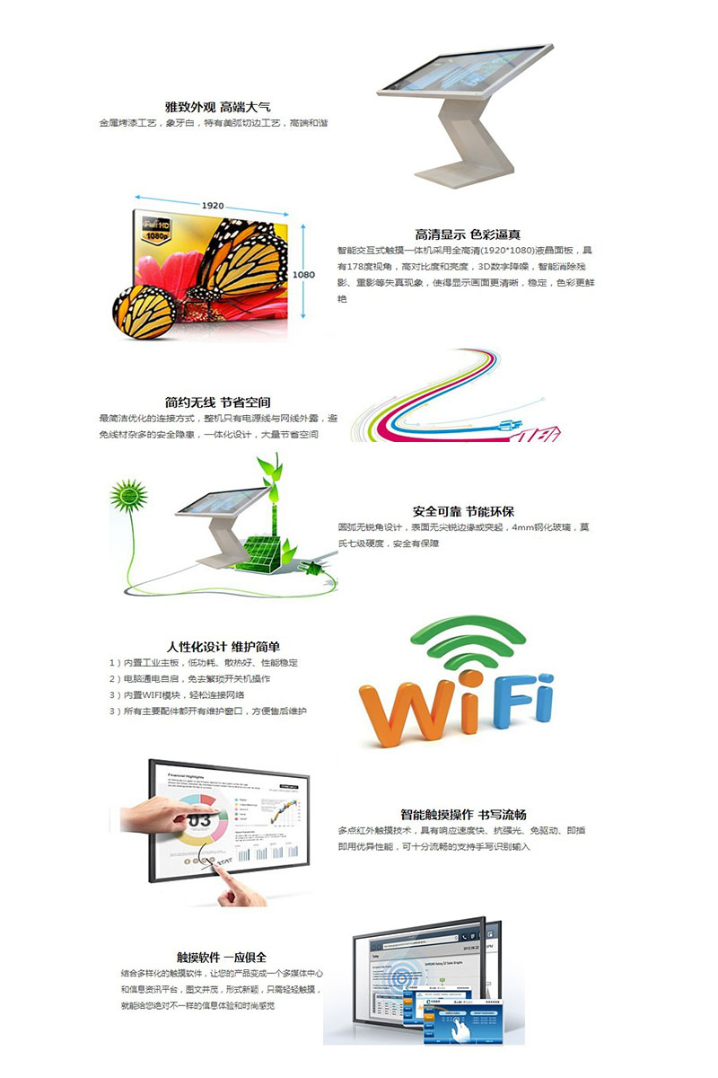 觸摸屏 (觸摸方式 電阻/紅外/電容/表面聲波/納米) | 觸摸方式 | 紅外兩點(diǎn)觸摸(可選觸摸點(diǎn)數(shù)) | 接口類型 | USB | 觸摸方式 | 手指、觸摸筆等不透光物體 | 響應(yīng)速度 | <6ms | 玻璃 | 4mm鋼化玻璃,莫氏7級(jí)防暴 | 理論點(diǎn)擊次數(shù) | 無(wú)數(shù)次 | 最小點(diǎn)擊物體 | 5mm | 電腦配置(可按要求選配) 電腦模塊 | 超薄插拔式模塊化電腦 | 主板 | Intel HM67-3 | CPU | Intel Mobile 2nd i3 2310M | 內(nèi)存 | DDR3/2GB, 1066/1333MHz 內(nèi)存顆粒 | 硬盤(pán) | 500G 2.5" SATA接口 | 顯卡 | 集成顯卡 | 系統(tǒng) | Microsoft Windows WIN7 系列/安卓系統(tǒng) | 連接接口 輸入 | HDMI×2,VGA×1,AV×1,YPbPr×1,TV×1,多媒體USB×1 | 前置接口 | USB×2 | 電源 電壓 | AC100V~240V (+/- 10 %),50/60Hz | 耗電量(待機(jī)) | ≤ 1W | 耗電量(典型值) | ≤ 160W | 隨機(jī)配件 主要配件 | 用戶手冊(cè),保修卡,合格證,電源線,遙控器、電池、白板光盤(pán),觸摸筆,壁掛支架 | 可選配件 | 落地支架,無(wú)線鼠標(biāo) | |